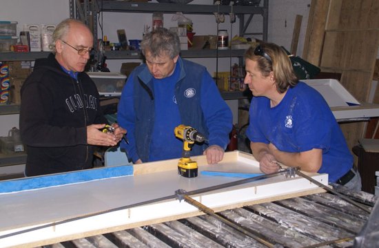 Concrete Countertops: Technical Details About ConcreteThe first step in the production of a concrete tops is to make a template of the cabinets or existing top. In this process, our mechanic makes a physical model to be sure that the new concrete countertop fits properly. There are cases when a template is not needed, for example if our cabinet division is making the cabinets that will go below the top. After templating, our next task is to make the molds for the tops (and sinks if they are part of the job). Mold making is a critical step because the shape of the mold dictates exactly the form of the countertops. For sinks, we can use one of our many existing molds, or we can create one made to the specifications of the job. ![]() Figure 1 (above): Making a counter top mold with a 2 rock face edge.